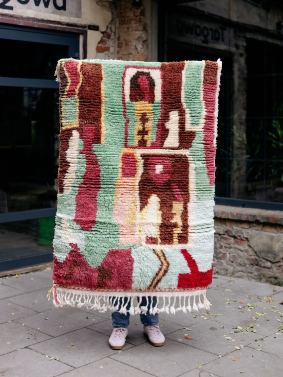Ręcznie tkany wzór składa się z bloków koloru i organicznych form, które układają się jak fragmenty wspomnień – krajobrazy, sylwetki, architektura. Całość przypomina abstrakcyjną pocztówkę z Maroka, pełną życia i symboliki. To dywan, który opowiada historię i przyciąga spojrzenia.
